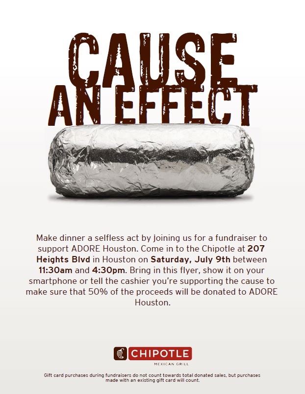 Come join us at Chipotle Mexican Grill in the Heights! Make lunch/dinner a selfless act by joining us for a fundraiser to support ADORE Houston. Bring this flyer, show it on your smart phone, or tell the cashier you’re supporting the cause to make sure that 50% of the proceeds will be donated to ADORE Houston